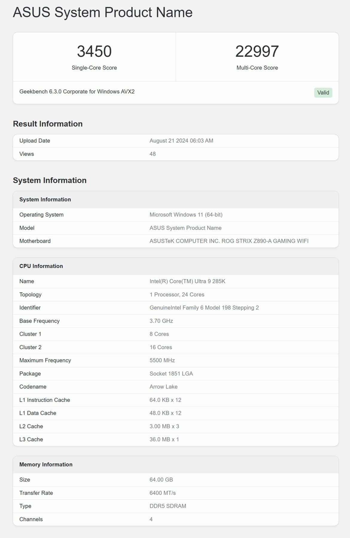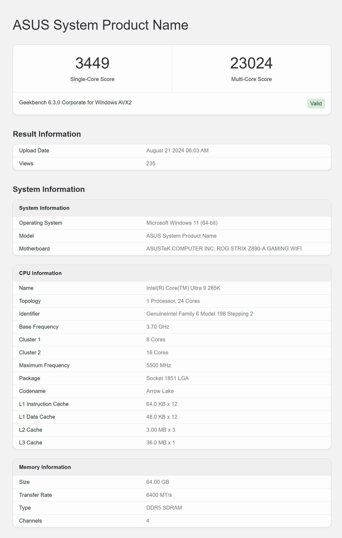 そして、これらのベンチマーク結果は開発段階のプロセッサによるものであり、最終製品ではさらなる性能向上が期待できる。テストに使用されたプラットフォームは、ASUS ROG STRIX Z890-A Gaming WIFIマザーボードと64 GBのDDR5-6400メモリという構成だった。この構成は、新しいLGA 1851ソケットを採用した次世代マザーボードの一例であり、8000 MT/s以上の高速メモリにも対応可能だ。より高速なメモリキットを使用すれば、さらなる性能向上が見込まれる。