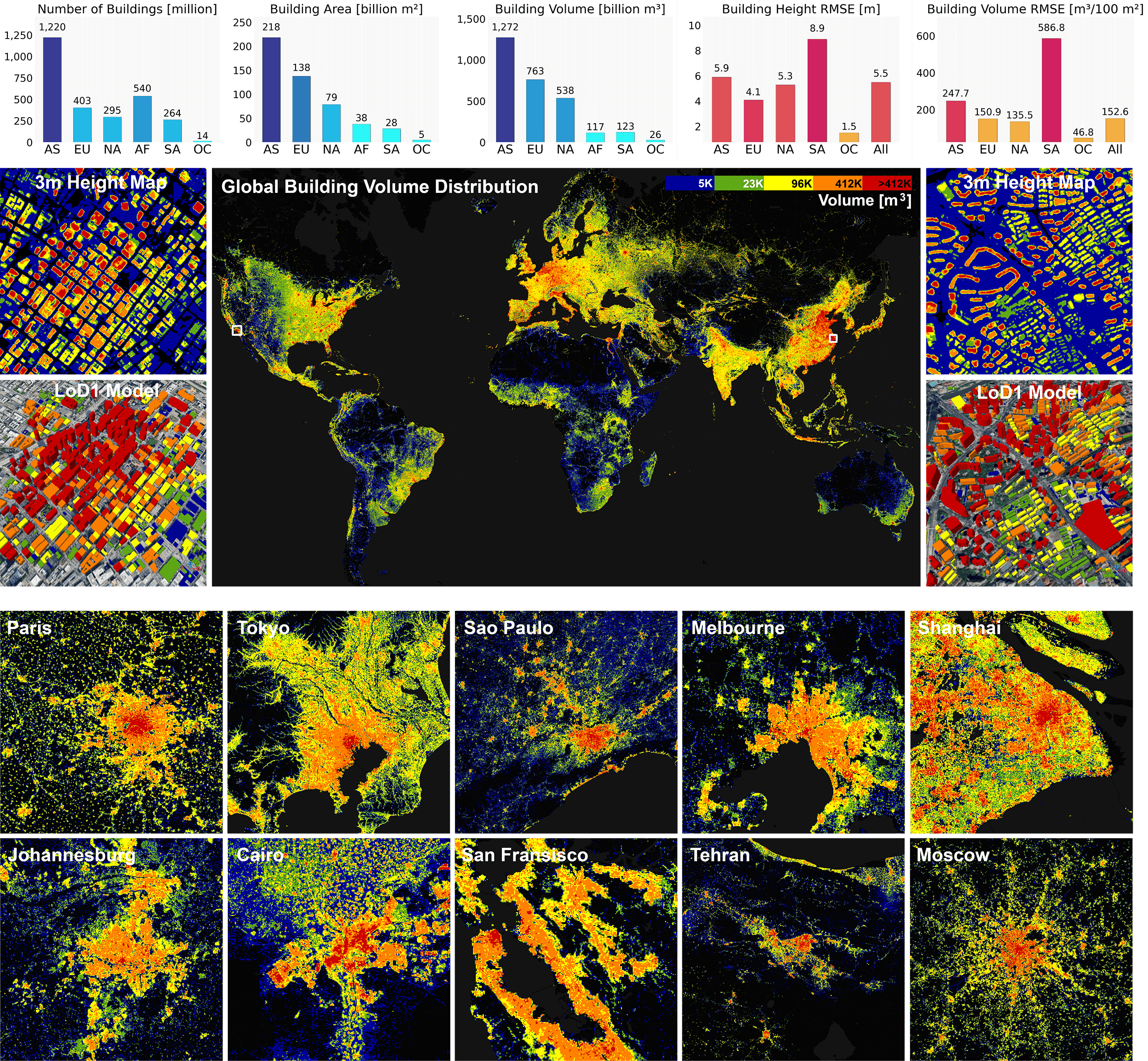 TUMのXiaoxiang Zhu教授率いる研究チームが開発したGlobalBuildingAtlasは、2019年の衛星画像を基盤として、世界中の建物のフットプリント(輪郭)と高さ情報を網羅している。