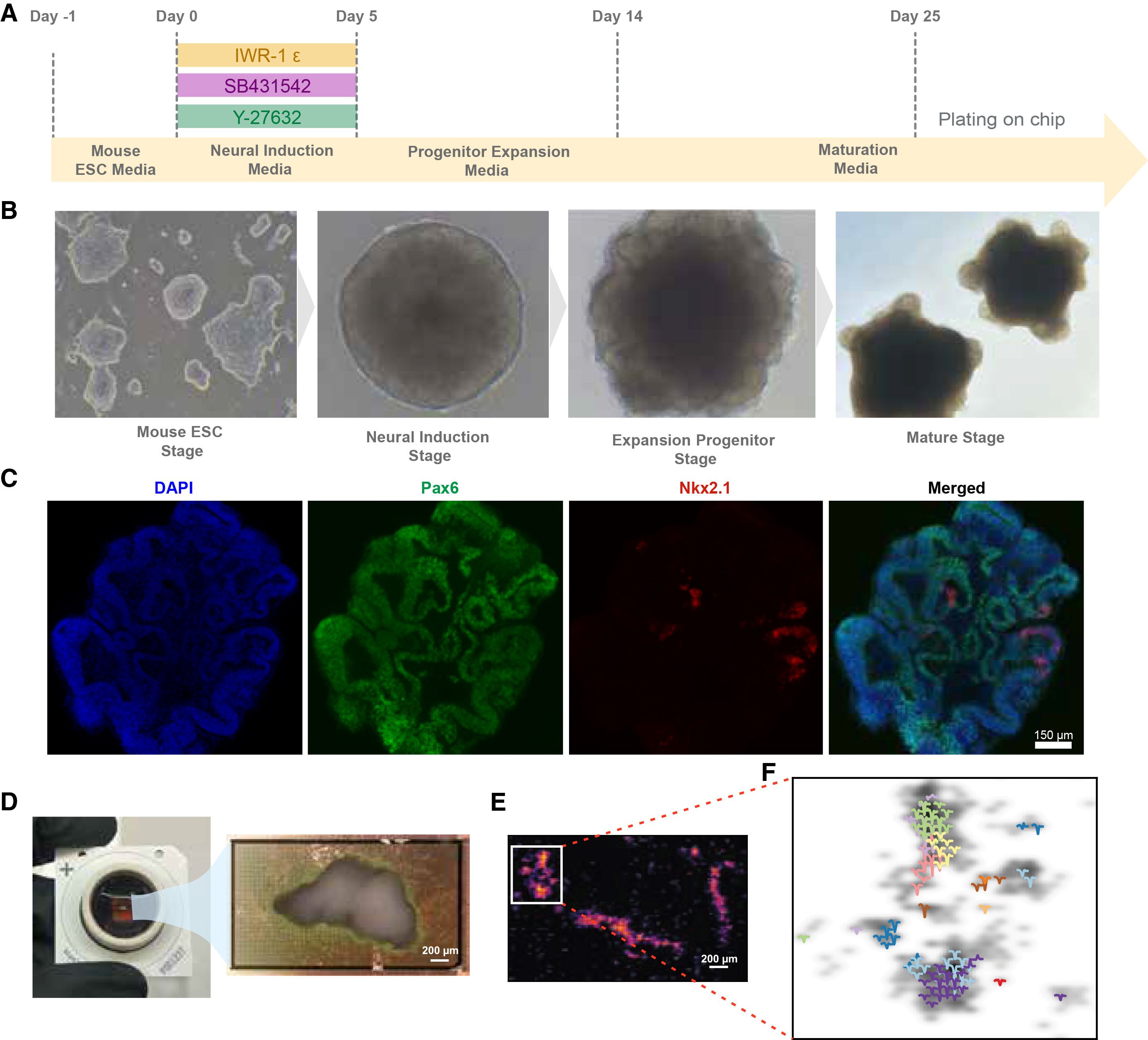 近年、バイオメディカル研究において広く用いられている「オルガノイド」とは、幹細胞から自己組織化プロセスを経て培養される、生体器官の構造や機能を模倣した三次元のミニチュア組織である。今回の研究では、マウス胚性幹細胞(ESC)から特定の誘導プロセスを経て培養された皮質オルガノイドが用いられた。黒コショウの粒よりも小さいこの組織内には、数百万個ものニューロン(神経細胞)が複雑なネットワークを形成し、電気信号を発火させながら互いに情報を伝達し合っている。
