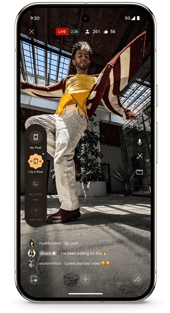 接続されたカメラ機能はGoogleの最新フラッグシップデバイスでのみ利用可能だが、セカンダリのビデオフィードにはPixel 6以降のデバイスを使用できる。また、GoPro HERO10 Black以降のモデルもサポートしている。この機能はFacebook、YouTube、Instagram、TikTok、Snapchatなどの人気のあるライブストリーミングアプリで動作する。
