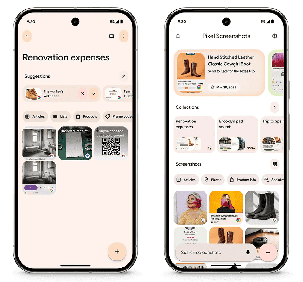 Pixelスクリーンショットでは、新たにコレクションに追加するスクリーンショットを自動的に提案する機能や、仕事用プロファイルを分けて別に使うことが出来る様になった。クライアントとの会食の領収書や経費報告書などを簡単に整理できる。