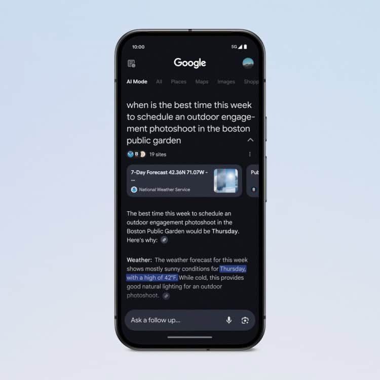 さらに重要な特徴として、このモードでは従来の検索結果ページのように下にスクロールして有機的な検索結果を見ることができない。代わりに、会話形式で検索を絞り込んだり、フォローアップ質問をしたりできる設計になっている。