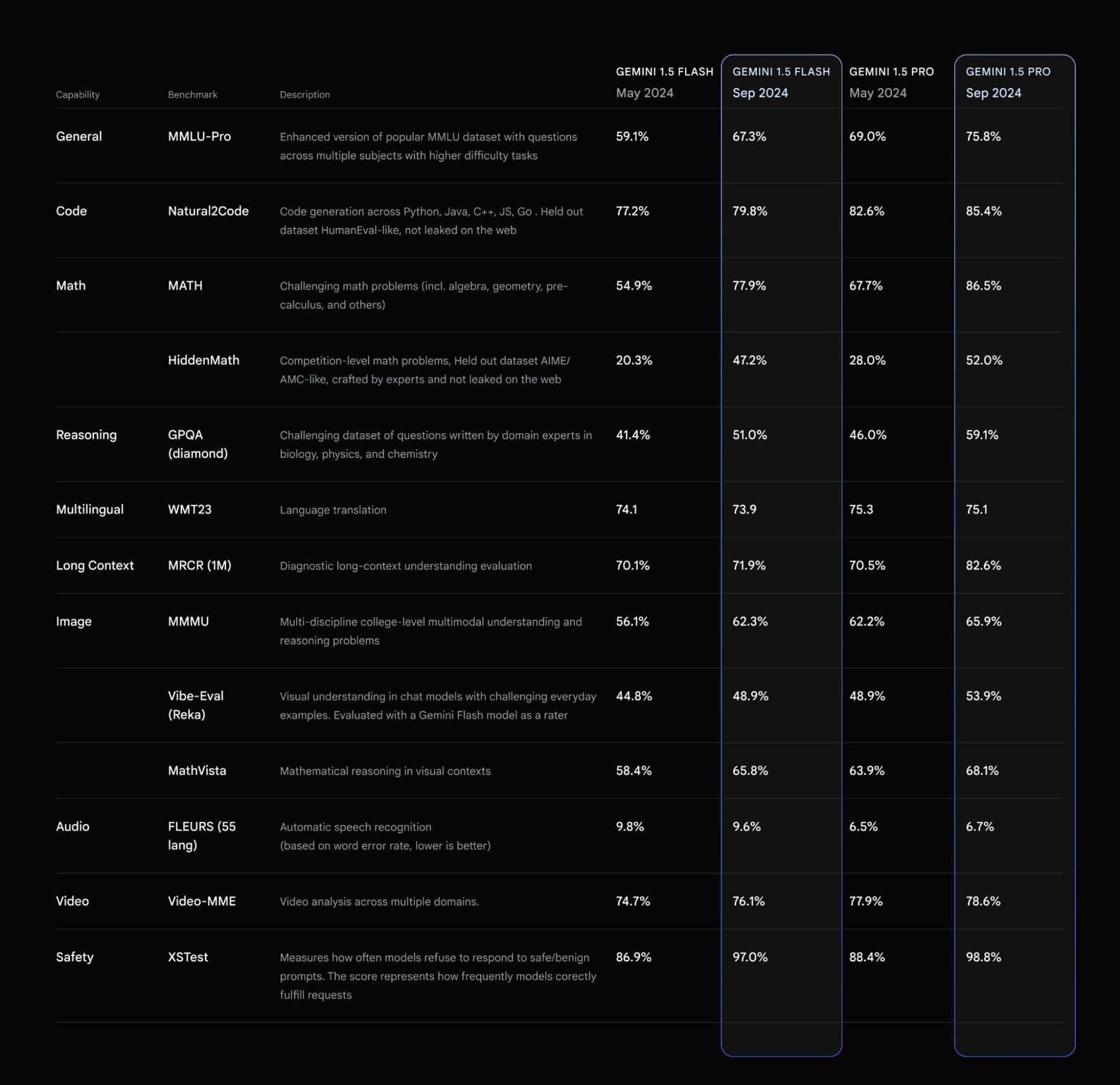 今回のアップデートでは、Gemini 1.5シリーズの性能が全面的に向上している。特筆すべき改善点として、MMLU-Pro(より難易度の高いMMMLUベンチマーク)で約7%の向上が見られた。さらに、数学関連のベンチマークであるMATHとHiddenMathでは、驚異の20%という大幅な性能向上を達成している。