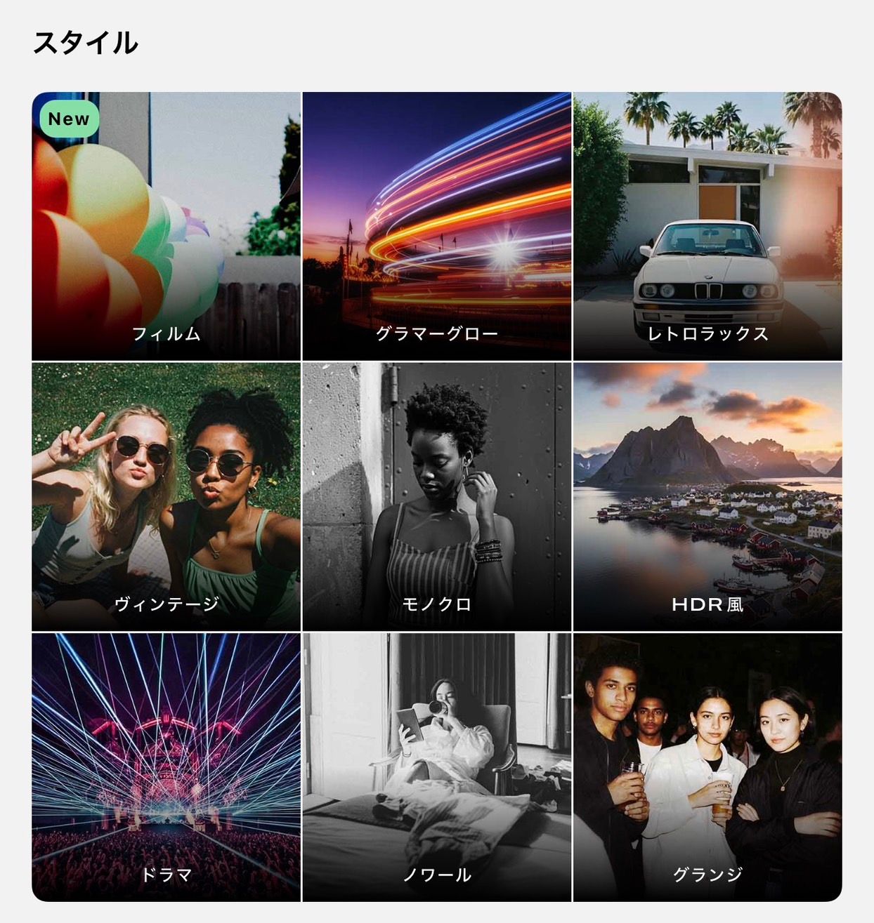 - 効果: プリセットされたフィルター群。ワンタップで写真の雰囲気を変えたいユーザー向けの入り口だ。