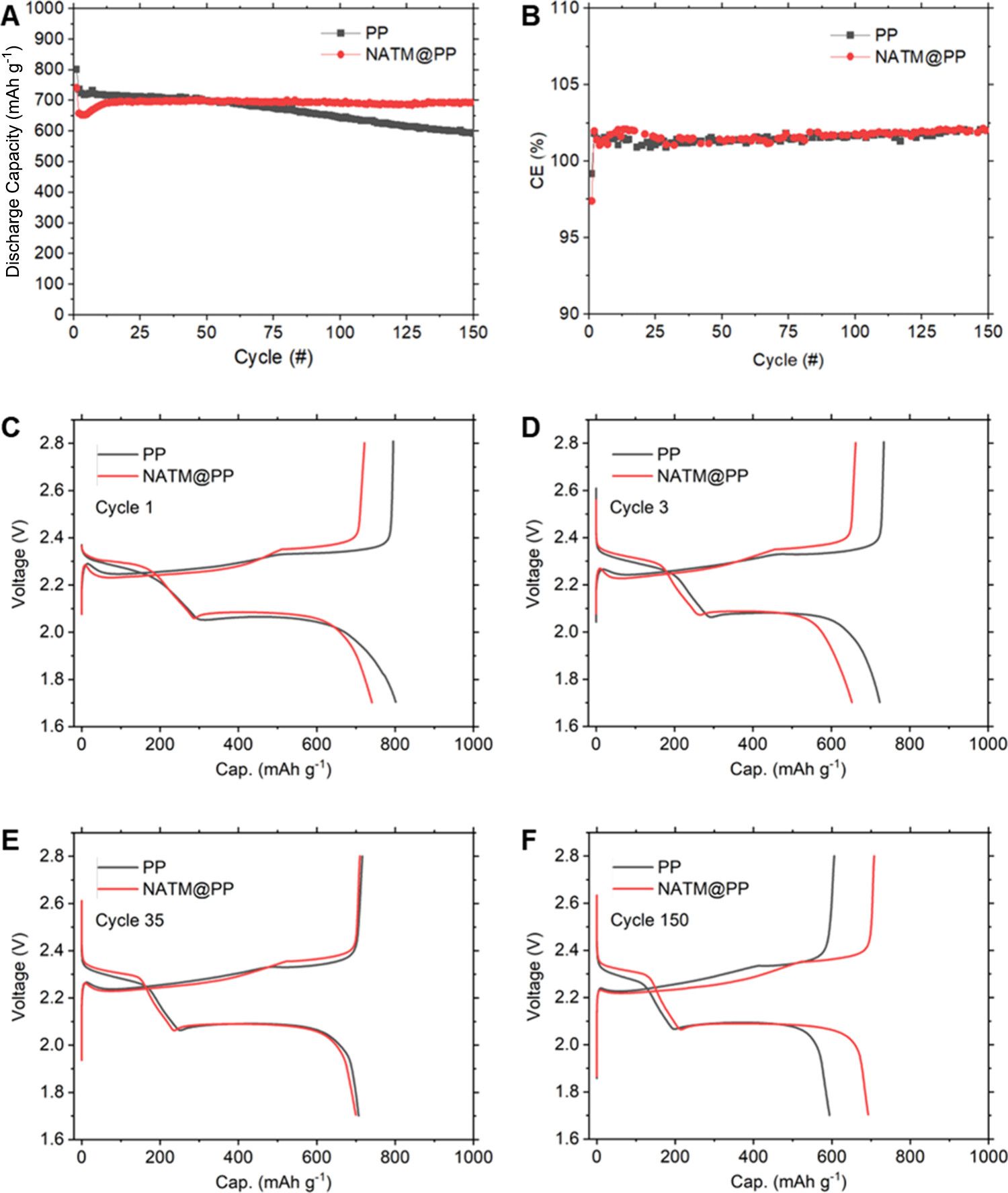 - NATM@PPセパレーター搭載電池: 15サイクル目から150サイクル目にかけて、放電容量は1グラムあたり約695mAhから694mAhへと、ほぼ全く低下しなかった。これは事実上、容量の劣化がゼロであることを意味する。 150回の充放電後も、初期(15サイクル目)の性能をほぼ100%維持したことになる。