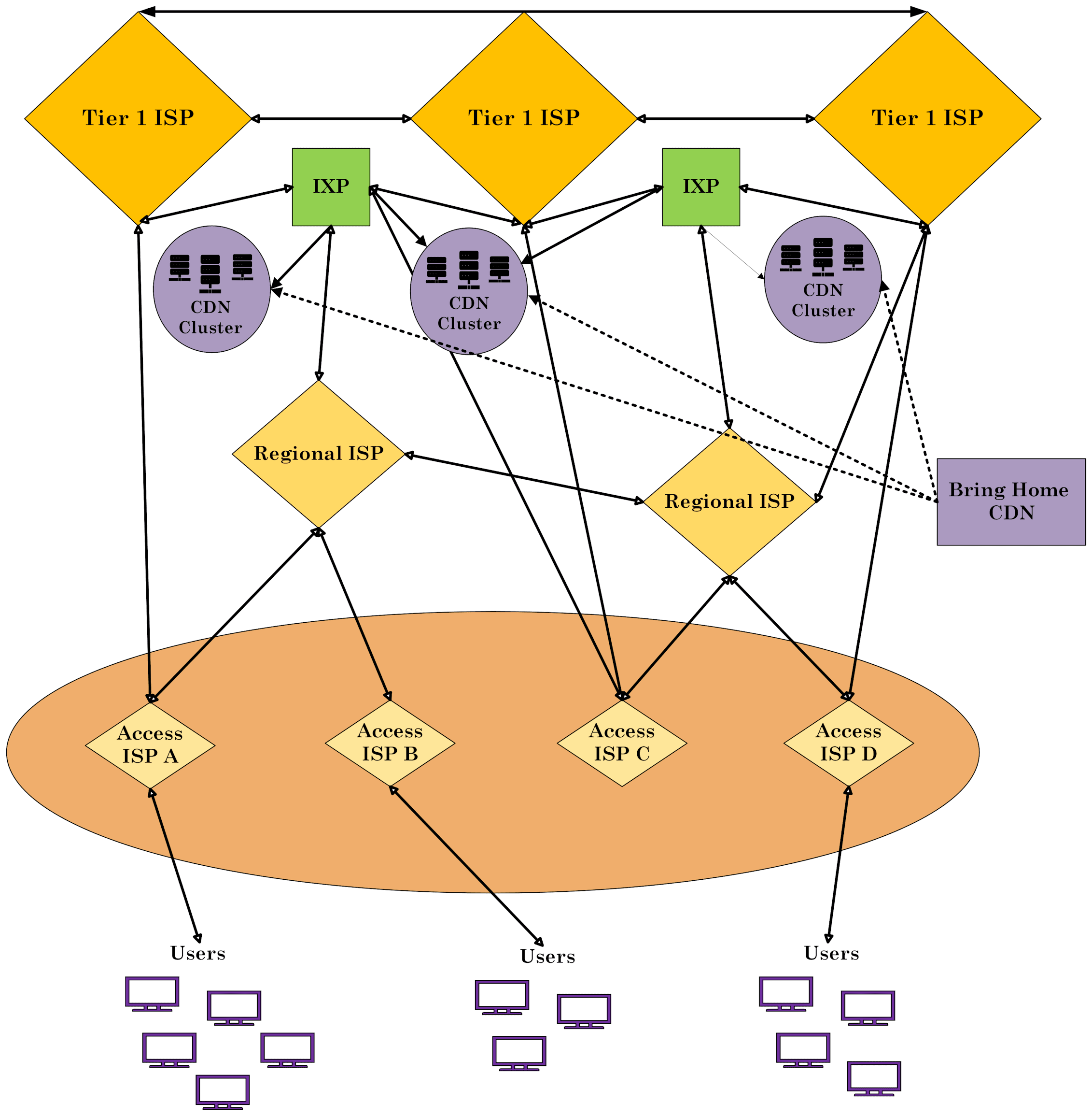 2つ目の戦略は「Bring Home」で、何百もの大きなプレゼンスポイントクラスターを戦略的な場所、通常はISPが相互接続するインターネットエクスチェンジポイントに展開する。これらのクラスターはEnter Deepアプローチよりもユーザーから遠いが、容量が大きいため、より高いトラフィック量を効率的に処理できる。