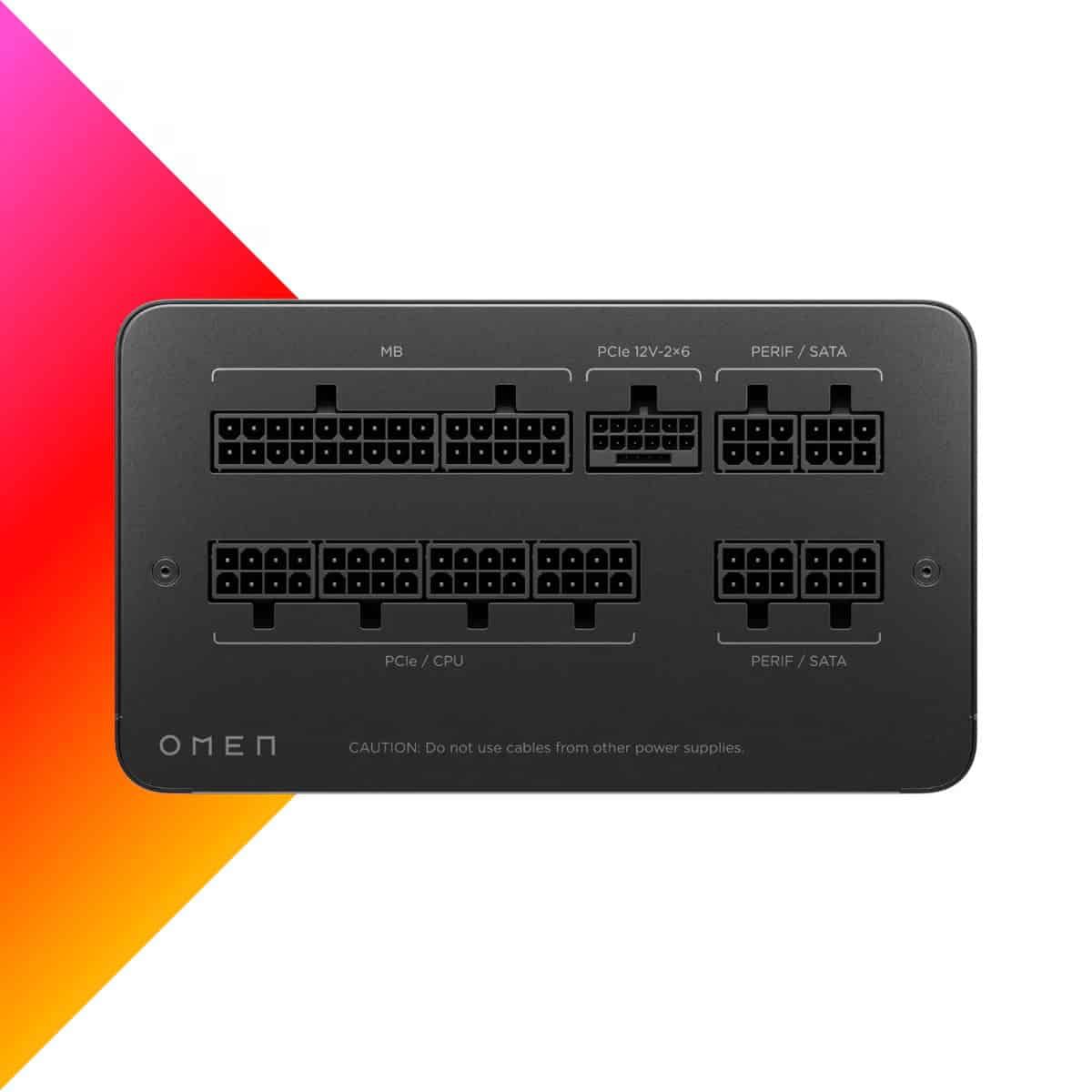 電源ユニットは、1000W出力のATX 3.1規格に準拠した「OMEN 1,000W PSU」で、Cybernetics PlatinumおよびPlus Gold認証を取得している。フルモジュラー設計で、最新のグラフィックカード向けに12V-2×6および12VHPWR接続に対応し、最大600Wの電力を供給できる。また、低負荷時にファンを停止させるZero RPMモードを搭載し、静音性も確保している。