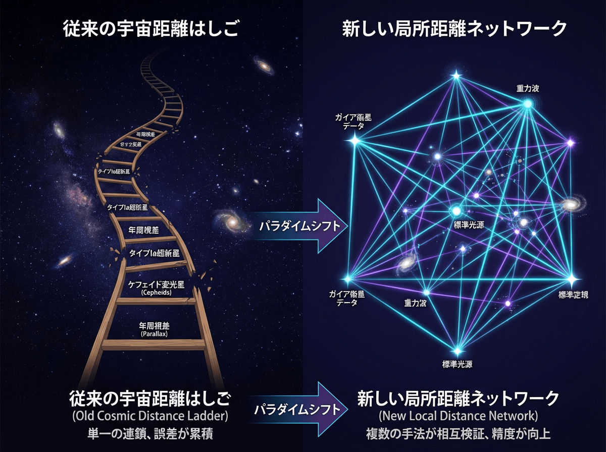 この絶望的な壁を前に、天文学者たちは長年「自分たちの観測機器のどこかに、見落とされた測定の偏りが潜んでいるのではないか」と疑心暗鬼に陥っていた。遠方の銀河までの距離を測る従来の局所宇宙測量は「距離の梯子」と呼ばれ、近距離の天体の測定結果を基準にして、より遠方の天体の距離を測るという一本道のアプローチに頼っていた。梯子の一段目にわずかな歪みがあれば、それより上の段の計算は掛け算のように全て狂ってしまう。この一本道の脆弱性をどのように克服し、ハッブル・テンションが単なる観測ミスなのか、それとも宇宙の根本的な物理法則の欠落を示すものなのかを確定させるにはどうすればよいのか。その切実な問いに対し、世界の天文学者たちが結集して導き出した答えが、かつてない規模の相互検証ネットワークの構築であった。