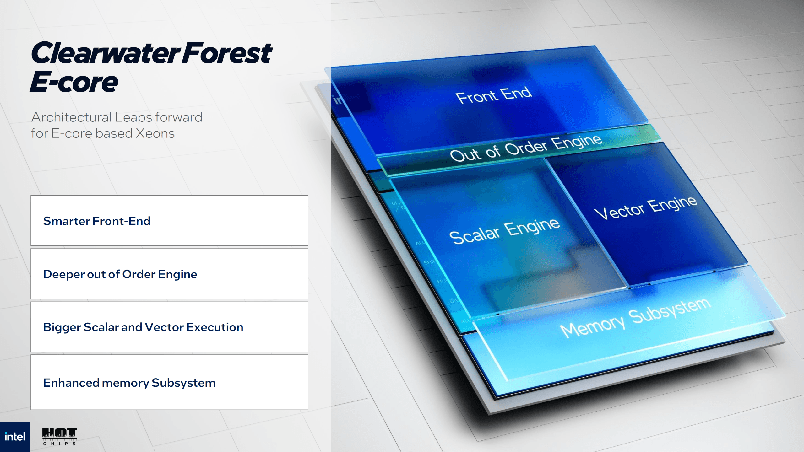 Hot Chips 2025の場で、Intelは次世代Eコア Xeon「Clearwater Forest」の技術的な詳細を明らかにした。同社の最先端プロセス「Intel 18A」を初めて採用し、最大288コアを集積、革新的な3Dパッケージング技術を駆使した、データセンターの電力効率とスループット密度を再定義するための戦略的製品と言えるだろう。本稿では、そのアーキテクチャの詳細と、技術的選択の意図と市場に与えるインパクトを見てみたい。