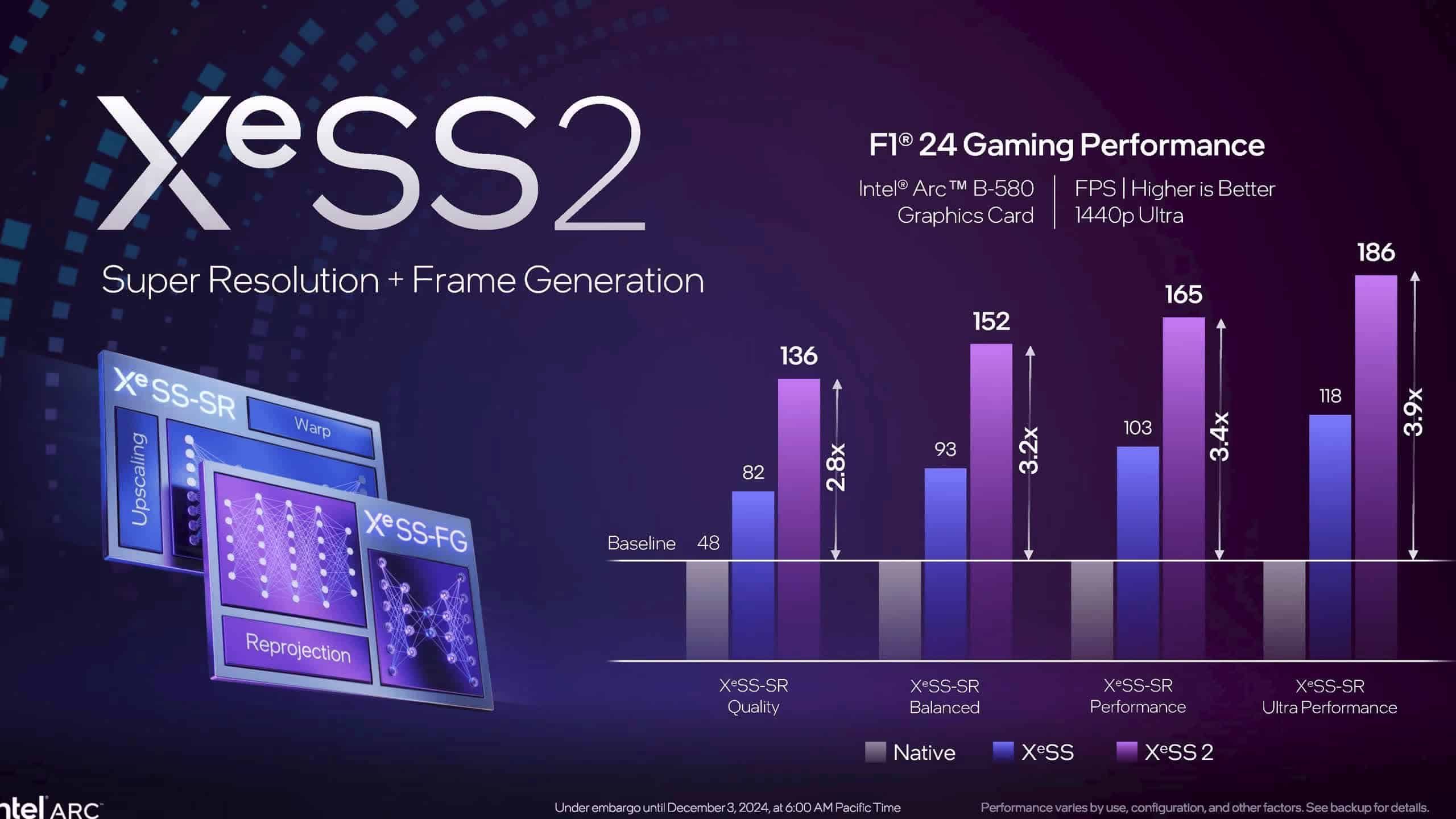 このプロセスの効果は具体的な数値でも確認できる。例えば『F1 24』では、XeSS Qualityモードでのアップスケーリングを有効にした場合、元の82FPSから136FPSへと大幅な向上を示している。これは実質的に、68FPSでレンダリングされた映像から136FPSの滑らかな出力を生成していることを意味する。さらに印象的なのは1440p Ultra設定での性能で、Ultra Performanceモードでは最大3.9倍、より高画質なQualityプリセットでも2.8倍のフレームレート向上を達成している。