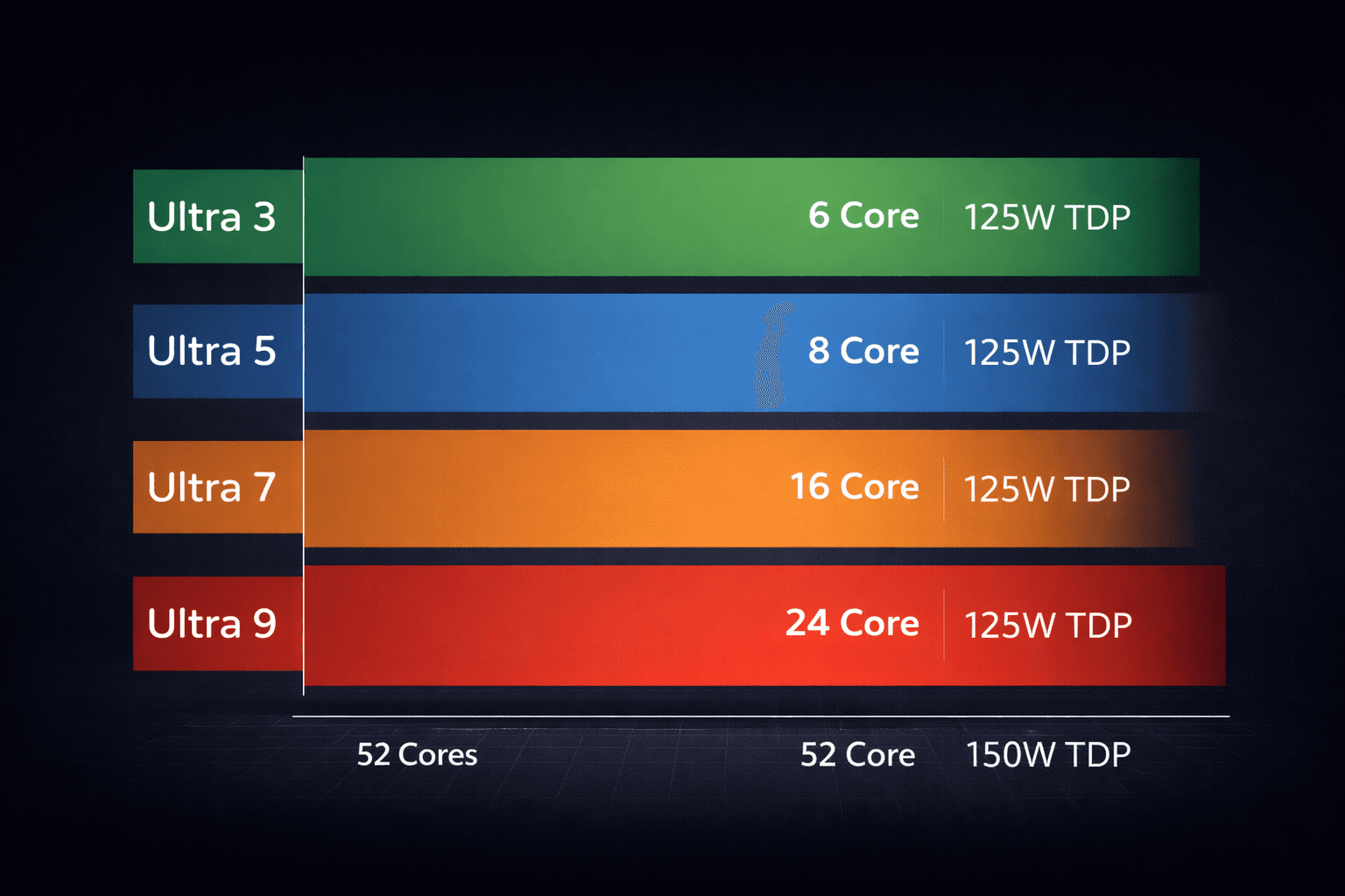 コンピュートタイルの枚数が製品階層を決定する。デュアルタイル構成は最上位の52コア(P3DX)と44コア(P2DX)のみで、いずれもTDP 175W。シングルタイル構成のCore Ultra 9/7/5/3は28コアから6コアまでをカバーし、TDP 35W〜125Wに収まる。