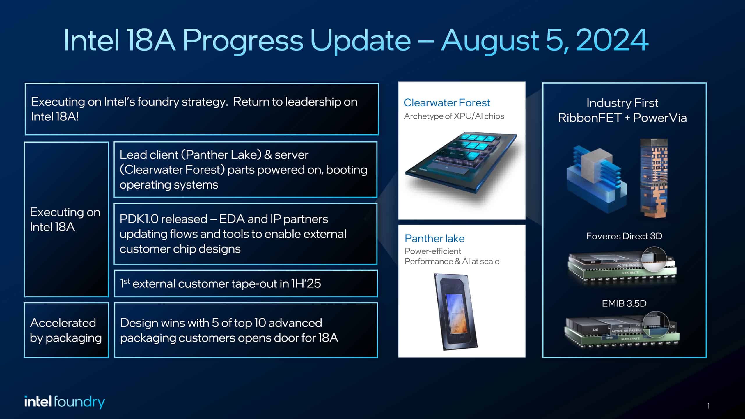 さらに、Intel 18Aの重要性は、単にIntel自身の製品開発だけにとどまらない。同社は、この最先端プロセスを外部顧客にも提供する計画を進めている。すでにIntel 18Aのプロセスデザインキット(PDK)バージョン1.0がリリースされ、EDAおよびIP企業がツールとデザインフローを更新している段階だ。これにより、Intelの顧客企業は最終的な製品設計を開始できるようになる。O’Buckley氏は、外部ファウンドリ顧客からの継続的な関心を見ていると述べ、これらの成果がIDM 2.0戦略とシステムファウンドリ戦略の有効性を示すシグナルになると強調している。