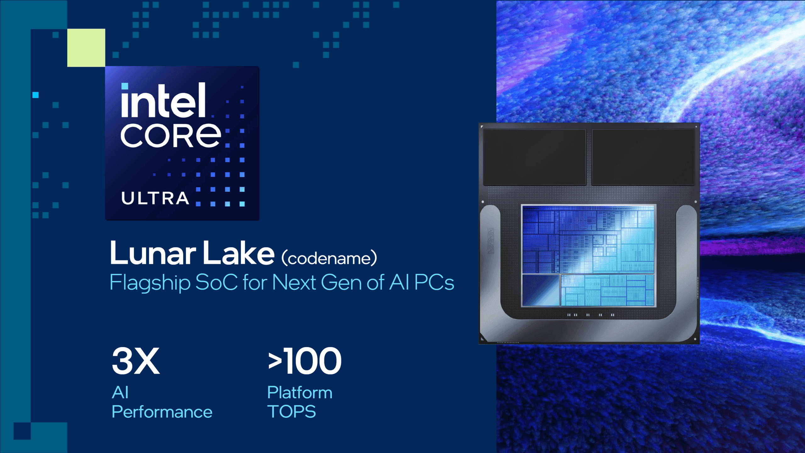 Gelsinger氏はプレゼンテーションの中で、Lunar Lakeは次世代AI PCの「フラッグシップSoC」になると述べている。同社によれば、Lunar Lakeは現在のMeteor Lake SoCの3倍のAI性能を持つとのことだ。現在、Intel最新のMeteor LakeはNPU、GPU、CPUを合わせて34TOPS程度で動作すると推定されている。Meteor Lake内のNPUを考慮すると、34のTOPSのうち11がNPUのみによるものだろう。