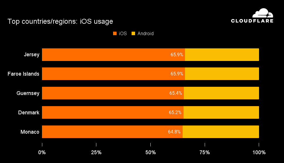 対照的に、デンマークのようなiOSの優勢な市場では、モバイルトラフィックの66%がiOSデバイスから発生している。この傾向は、高所得国においてApple製品の人気が高いという一般的な観察と一致する。しかし、注目すべきは、iOSが60%以上のシェアを獲得できている国と地域がわずか8つに留まるという事実だ。これは、グローバル市場においてAndroidの優位性が極めて強固であることを示している。