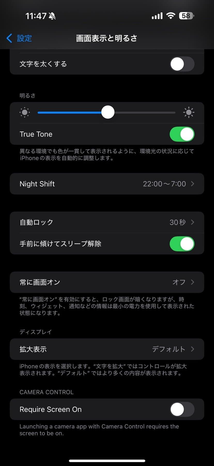 設定アプリの「画面表示と明るさ」の中にある、「Requires Screen On(スクリーンオンが必要)」は、デフォルトでオンになっているが、これをオフにすることでカメラコントロールボタンでカメラが一発起動するように変更出来る。