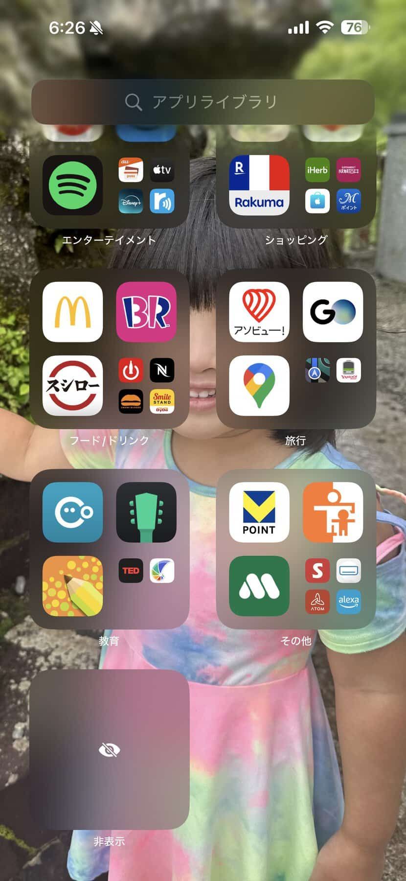 ホーム画面のアプリアイコンやウィジェットは例えば下の方に配置して上のスペースを空けて背景に指定した子どもの写真の顔が隠れないようにすることが出来たり、中心だけに空間を作ってフォトフレームのように仕上げることも出来る。