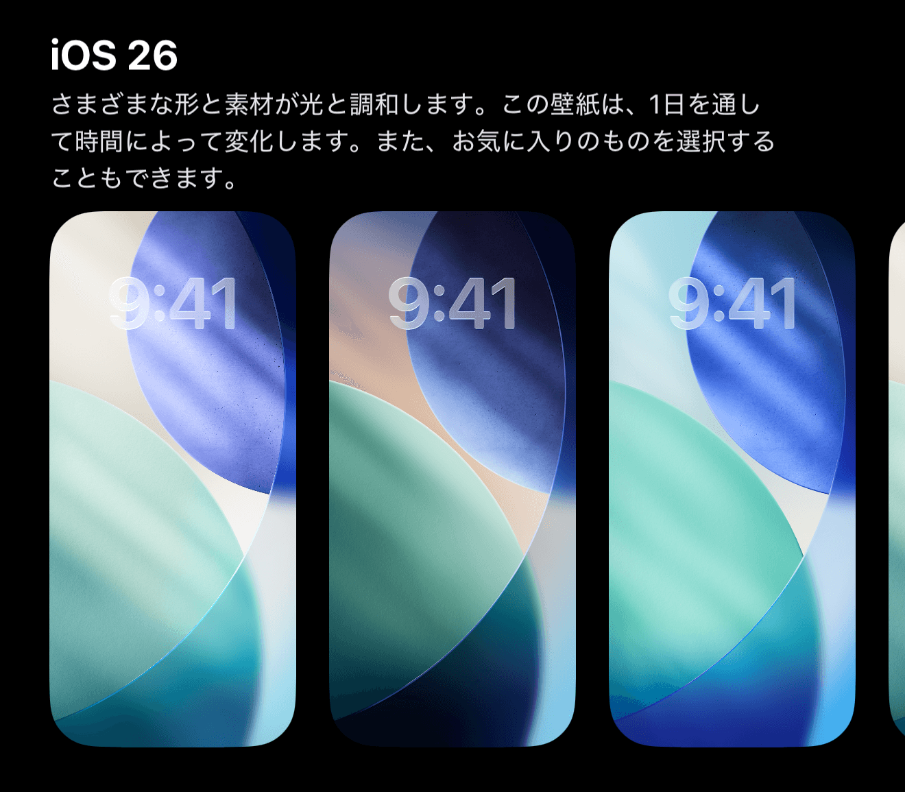 - ダイナミック壁紙: iOS 26の新しいデフォルト壁紙に「ダイナミック」オプションが追加された。「Dusk」「Halo」「Shadow」「Sky」といった複数のカラーテーマが、時間帯に応じて自動的に移り変わる。