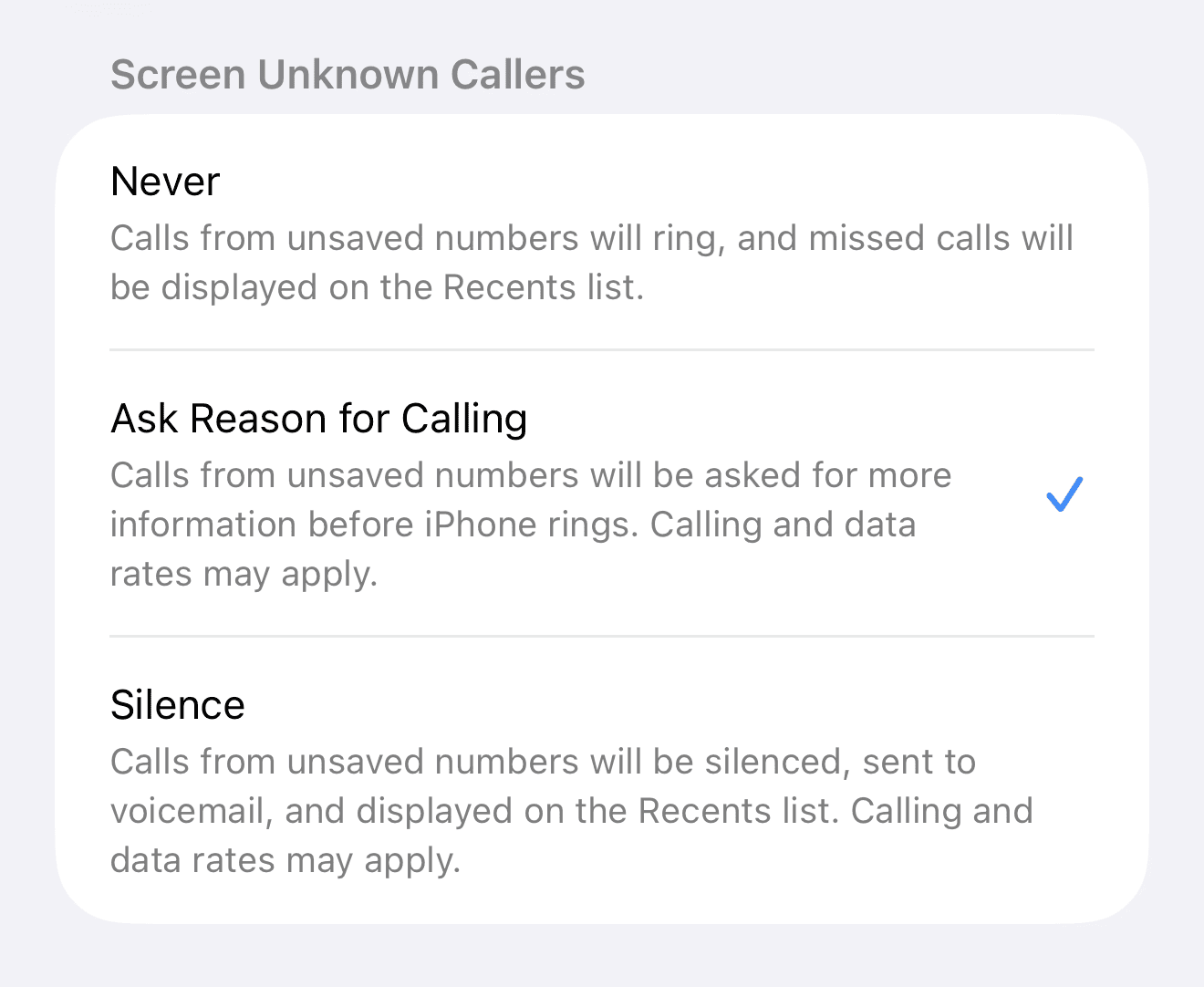 - Ask Reason for Calling (理由を尋ねる): iPhoneが自動で応答し、相手に用件を尋ねてから着信を知らせる。