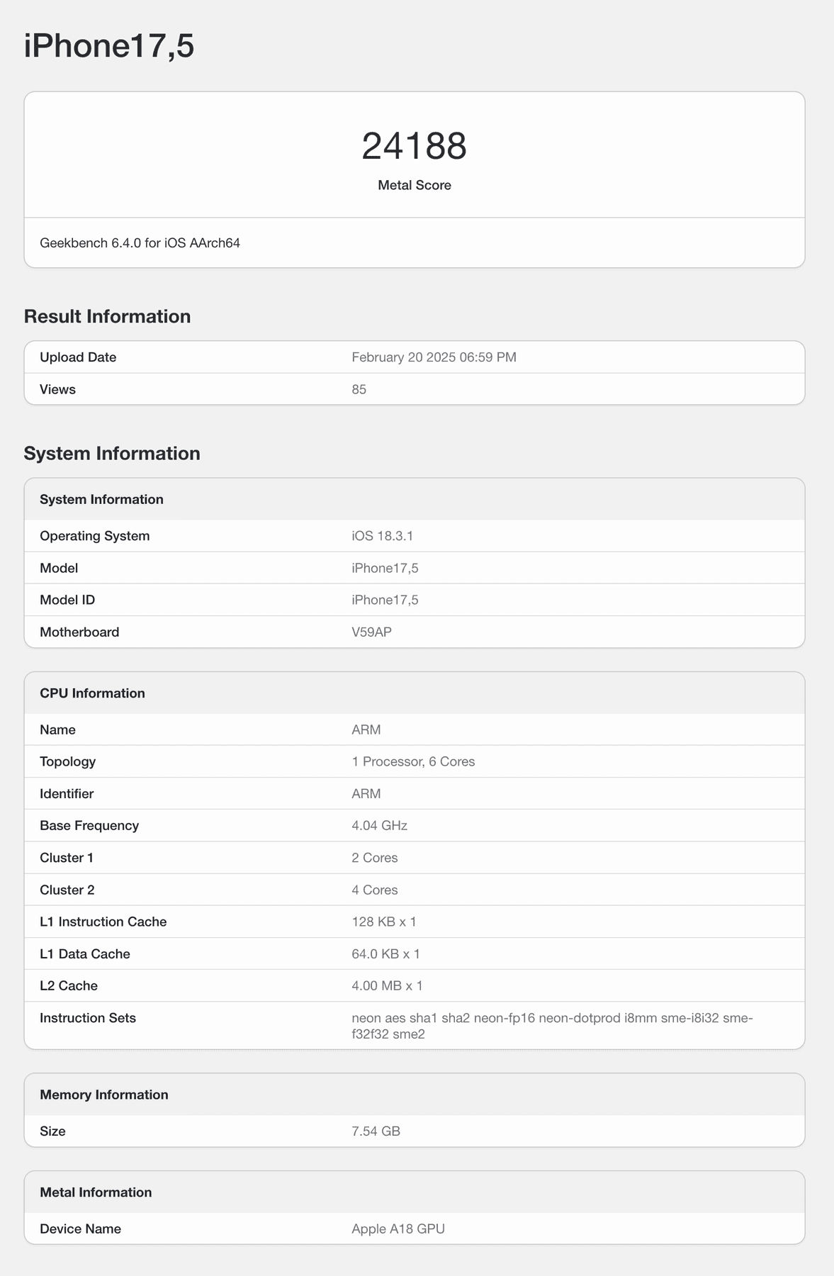 iPhone 16eは、iPhone 16と同じA18チップを搭載しているが、チップビニングと呼ばれる手法により、GPUコア数が5つから4つに削減されている。Geekbench 6 Metalのベンチマークスコアは24,188で、これは、iPhone 16の27,669、iPhone 16 Plusの27,772と比較すると、約13〜15%低いスコアである。