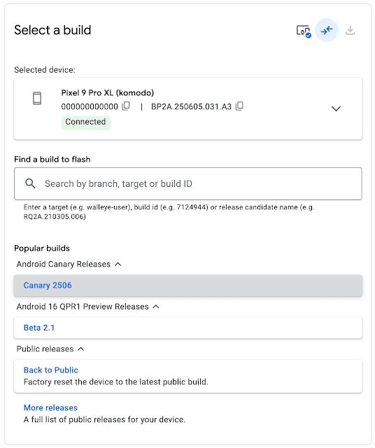 - 実行: PCのブラウザで「Android Flash Tool」にアクセスし、画面の指示に従ってCanaryビルドをデバイスにフラッシュする。