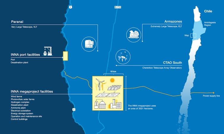 強力な米国投資家の支援を受けるエネルギー供給会社AES Chileは、2024年12月に天文台近くでの大型産業プラントと輸送ハブの開発計画を発表した。このプラントはグリーンエネルギー用の液体水素とアンモニアを生産する予定である。