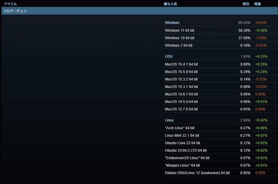 実際に、Steamの調査データ(Linuxプラットフォーム詳細)を見ると、その傾向は明らかだ。