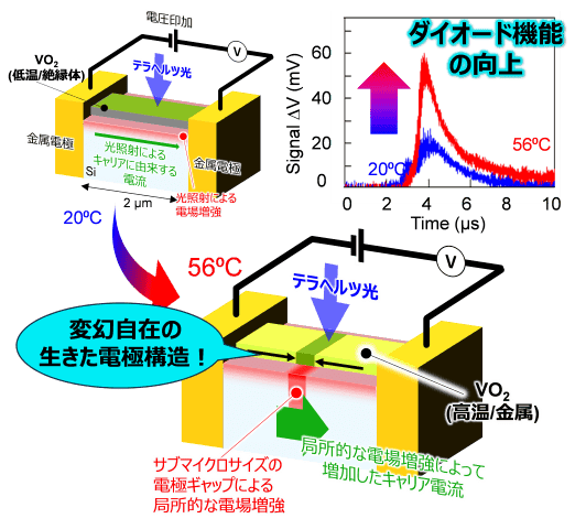 温度を適切に調整すると、VO2の金属ドメインが導電性ネットワークを形成し、シリコン層内の局所的な電場を制御し、テラヘルツ光に対する感度を高める。