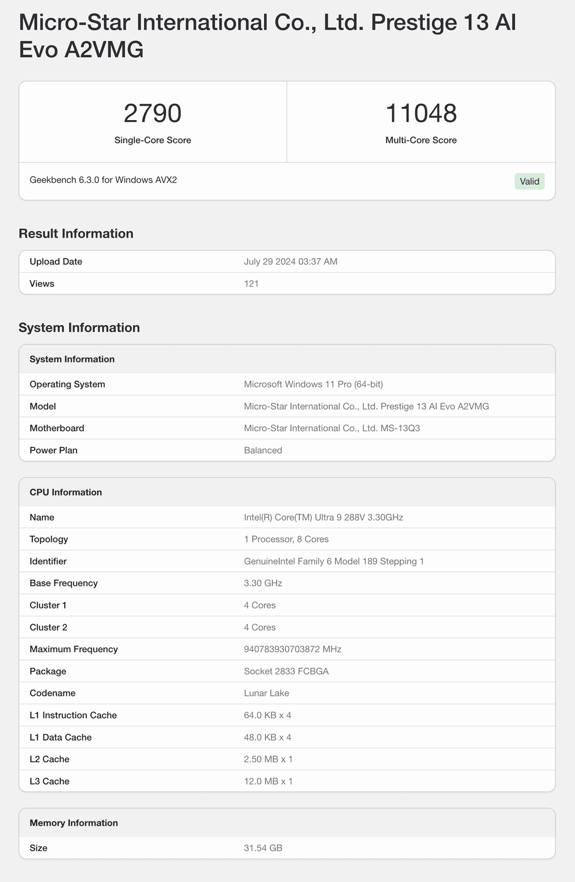 - Geekbench Browser: Micro-Star International Co., Ltd. Prestige 13 AI Evo A2VMG