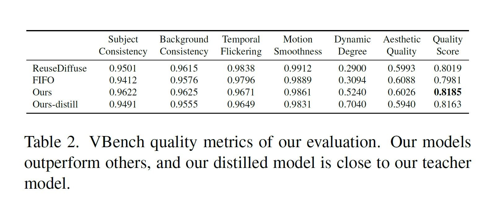VBenchと呼ばれる動画品質評価ベンチマークを用いた定量評価(論文 Table 2)では、多くの指標でStreamDiTが優位だったが、特に差が顕著だったのが「Dynamic Degree(動きの度合い)」である。既存手法が静的なコンテンツを生成しがちだったのに対し、StreamDiTは遥かにダイナミックで動きのある動画を生成できることが示された。