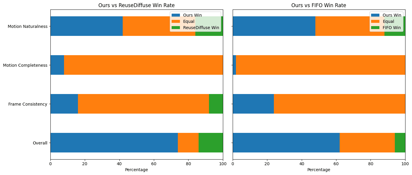 さらに、人間による評価(下グラフ)では、その差はより明確になった。「総合的な品質」「フレーム間の一貫性」「動きの完全性」「動きの自然さ」といった全ての評価項目で、StreamDiTは競合手法を圧倒。これは、技術的な優位性だけでなく、ユーザーが実際に感じる「質」の高さが卓越していることを意味する。