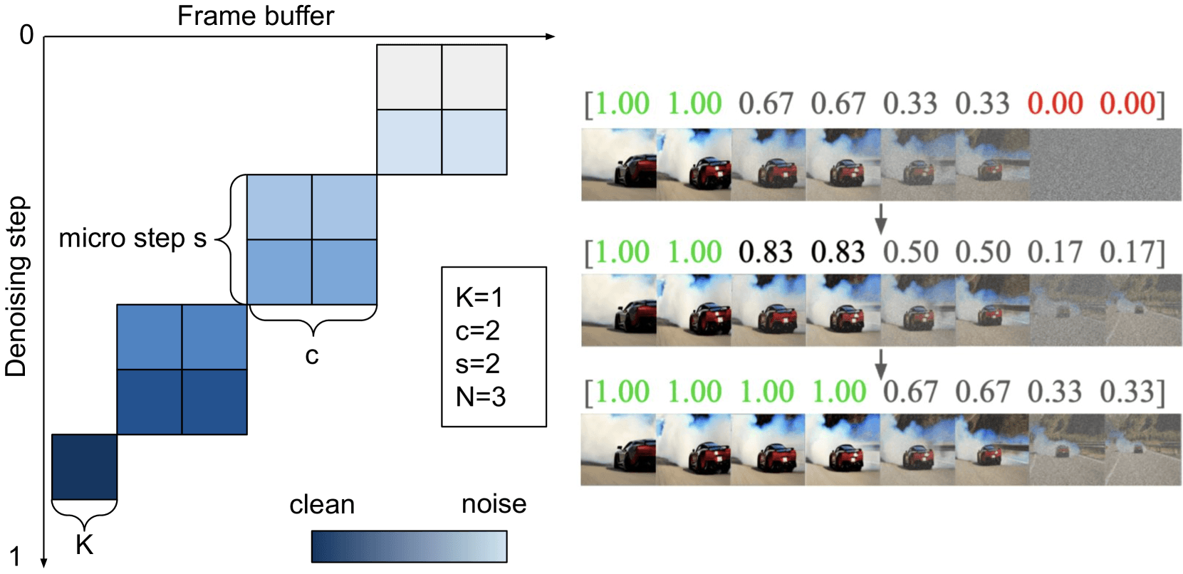StreamDiTでは、この蒸留を独自にカスタマイズ。元々、高品質な1フレームを生成するためには128回の計算ステップ(サンプリングステップ)が必要だった。研究チームは、この128ステップの複雑な処理を、わずか8ステップで模倣できる生徒モデルを蒸留によって作り出した。