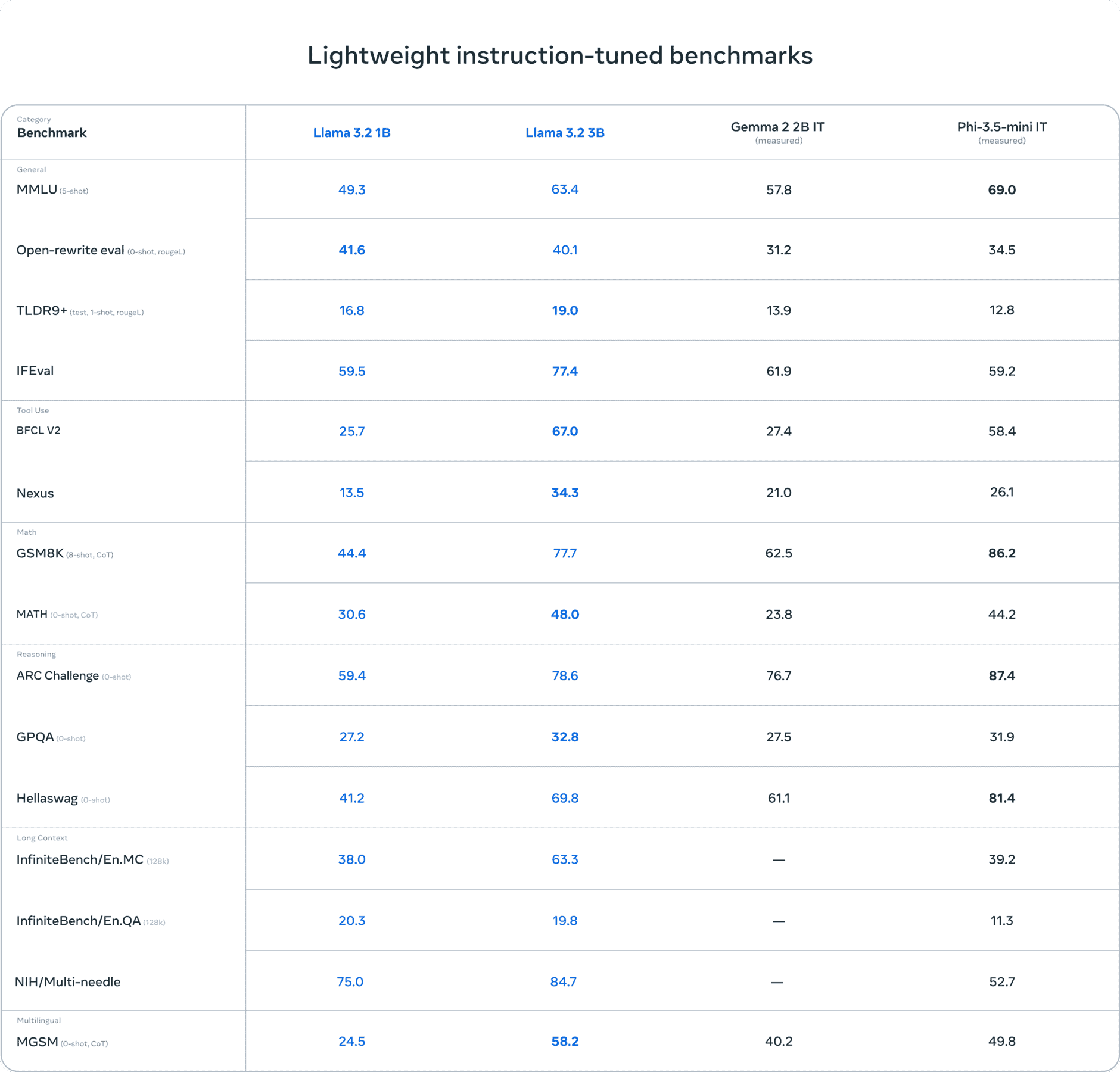 Metaの評価によると、3Bモデルは指示に従う能力、要約、プロンプトの書き換え、ツールの使用などのタスクにおいて、Gemma 2の2.6BモデルやPhi-3 3.5-miniモデルを上回る性能を示している。一方、1BモデルはGemmaと競争力のある性能を持つという。