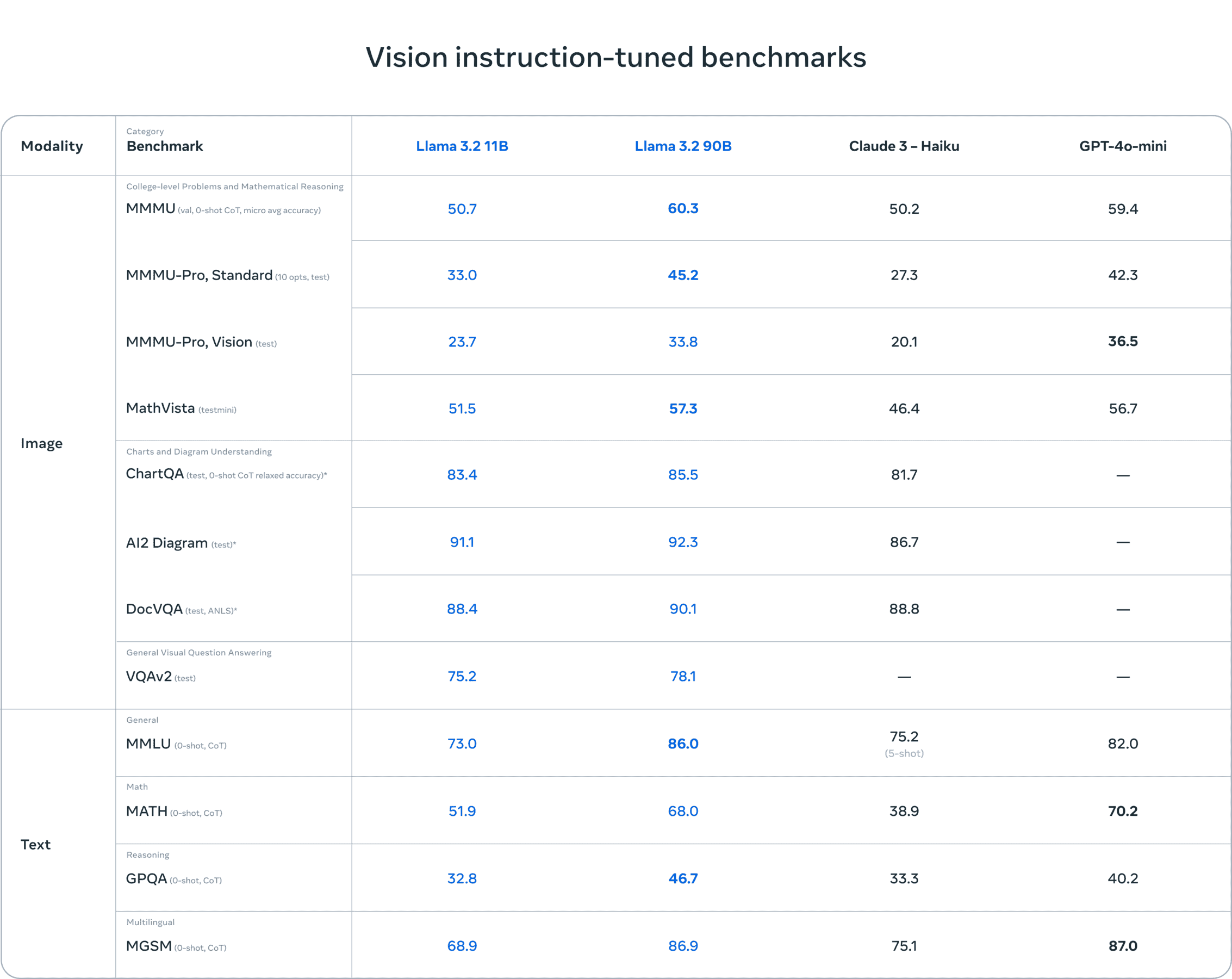 Metaのベンチマークによると、Llama 3.2の11Bおよび90Bモデルは、画像理解タスクにおいてClaude 3 HaikuやGPT-4o miniなどの主要なクローズドモデルと同等の性能を発揮するという。また、オープンソースの競合であるMistralも最近、Pixtralという初のビジョンモデルを発表したが、パラメータ数は大幅に少ない。