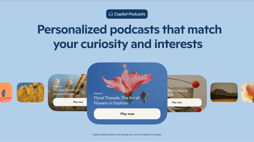 Podcasts機能は、ユーザーの興味に基づいてパーソナライズされたAI生成のオーディオコンテンツ(ポッドキャスト)を作成・配信する機能だ。休暇の計画や住宅購入の比較検討、特定の研究論文やWebサイトの内容解説など、様々なトピックについてCopilotがポッドキャストを生成する。GoogleのNotebookLMにあるAudio Overviewsがイメージとしては近いかもしれない。リスナーは再生中もCopilotと対話し、さらに深く学んだり議論を続けたりできる。これにより、情報消費の新しい形が提供されるが、これらの音声システムも誤情報を含む可能性(ハルシネーション)から免れない点には注意が必要だ。