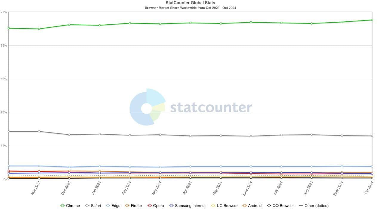 市場シェアの動向を詳しく分析すると、Google Chromeの支配的立場がさらに強まっていることが明確になってきた。2024年11月の最新データでは、Chromeのシェアが66.31%に到達し、2024年における最高値を更新。前月からの伸びは1.09ポイントと大きく、さらに前年同月との比較では実に4.25ポイントもの上昇を記録している。これは年間で約6.8%の成長率に相当し、すでに高いシェアを持つブラウザとしては極めて大きな伸びと言える。
