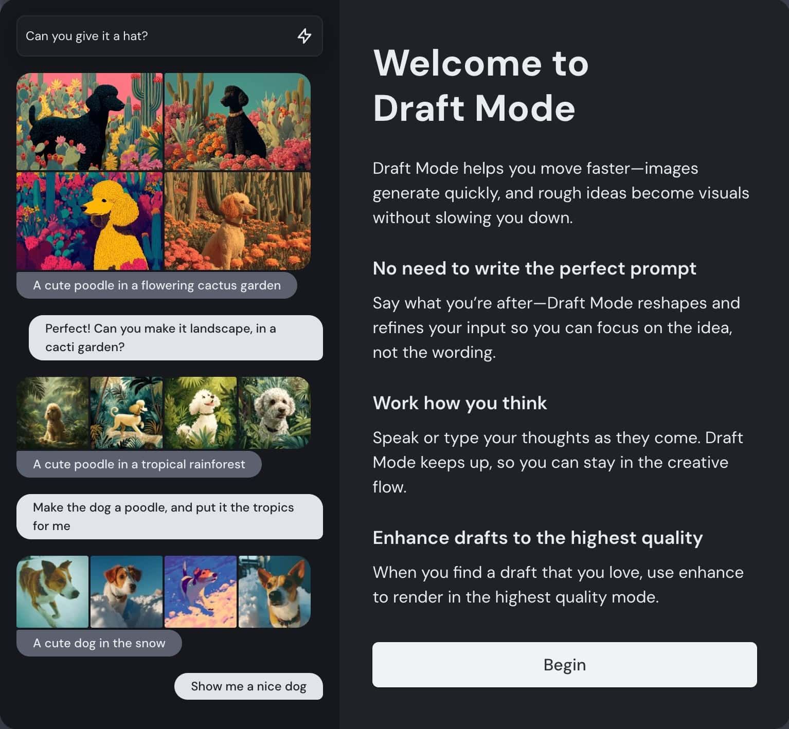 - 利用シーン: アイデアを素早く形にしたい場合や、多様なバリエーションを試したい場合に最適だ。Webインターフェースでは、ドラフトモード使用時にプロンプトバーが「会話モード」に変化し、「猫をフクロウに変えて」「夜にして」といった指示を出すだけで、AIがプロンプトを自動で修正し、新しい画像を生成し始める。マイクボタンを使えば「音声モード」となり、思いついたアイデアを話すだけで次々と画像が生成される、「まるで液体の夢のように画像が流れ出す」体験が可能だとHolz氏は説明する。