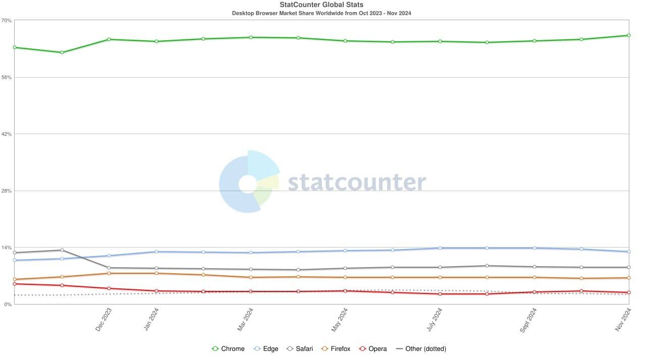 MicrosoftのEdgeも13%のシェアを割り込んでいるが、Mozillaも芳しくはなく、Google Chromeの独占は生成AIの登場によっても脅かされていないのが現状だ。