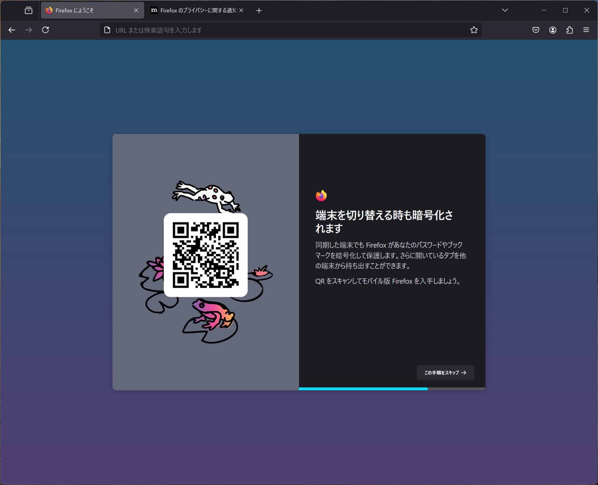 最終段階では、モバイル版Firefoxのインストールを促すQRコードが表示され、デスクトップとモバイルの両環境でのFirefox活用を推奨する。セットアップ完了後も、ツールバーに「Firefoxのセットアップを完了」というオプションが表示され、タスクバーへのピン留めやデータのインポート、拡張機能の追加、Firefoxアカウントへのサインインなど、未完了の設定項目を確認できる仕組みが用意されている。