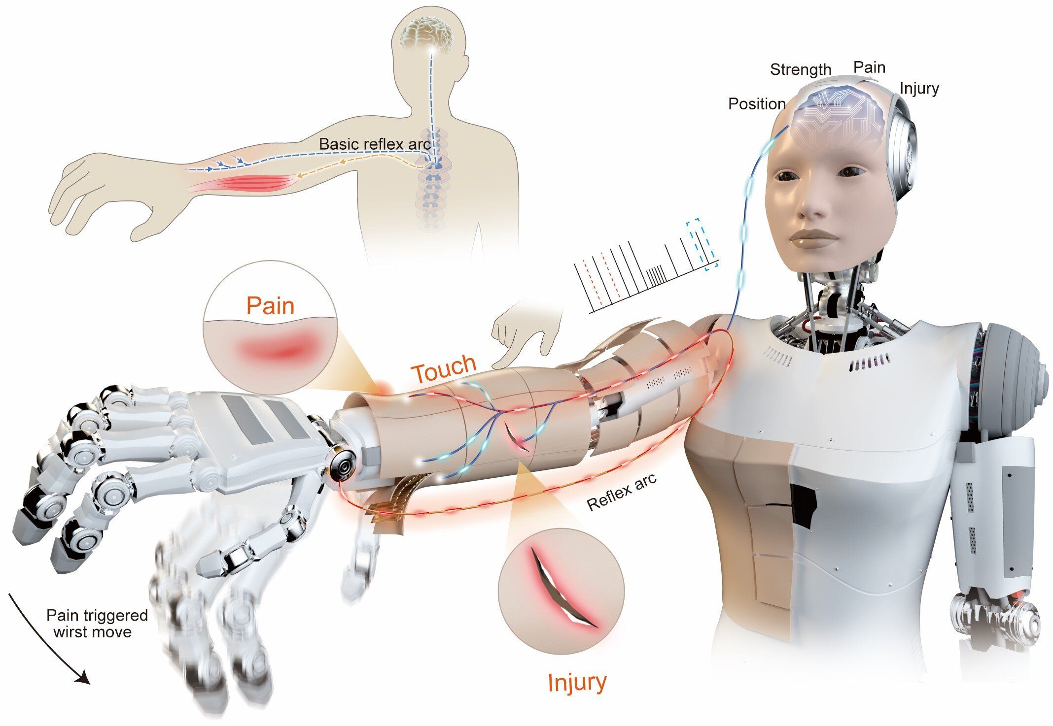 「痛み」と判定されるほどの強い圧力が加わると、皮膚システムはCPUでの処理を待つことなく、高電圧のスパイク信号を直接アクチュエータ(モーター)へと送信する。これにより、ロボットは「考える」前に即座に腕を引っ込めるなどの回避行動をとることが可能となる。