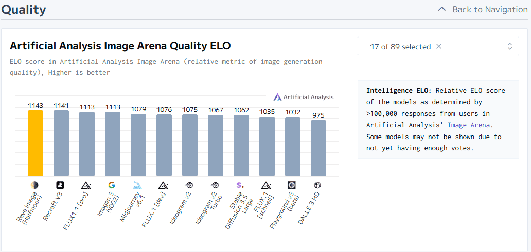 第三者のAIモデルテストサービスであるArtificial Analysisによるベンチマークでは、Reveは「画像生成品質」においてトップを獲得し、MidJourney v6.1、GoogleのImagen 3、Recraft V3、Black Forest LabのFLUX.1.1 [pro]などの競合を上回っている。ベンチマーキンググループは、画像内テキストの明確さと可読性という歴史的に難しいタスクにおけるReveの能力を特に高く評価している。