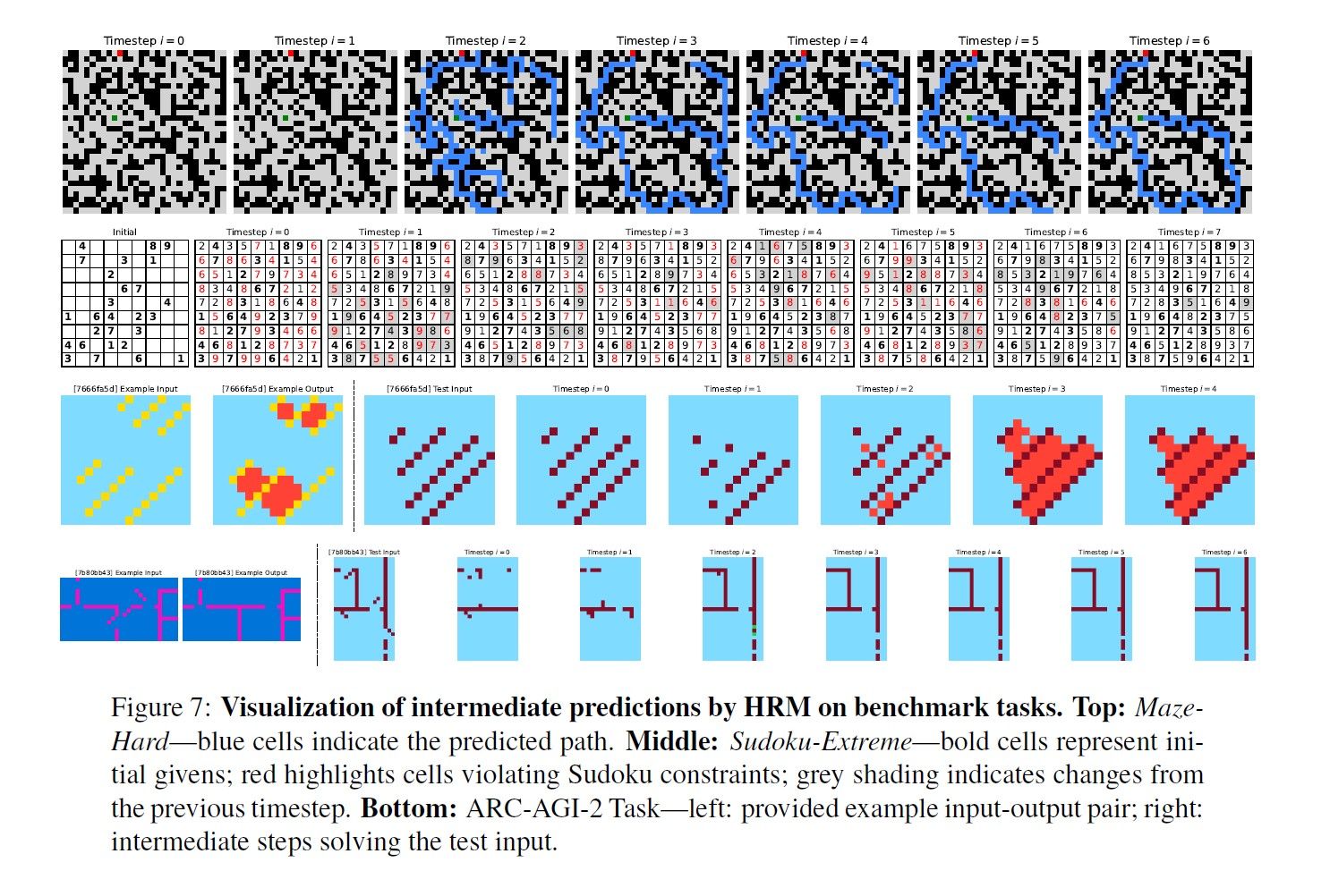 論文で公開されたHRMが迷路を解く際の内部状態の可視化を見ると、その思考プロセスの一端を垣間見ることができる。初期段階では、複数の可能性のある経路を同時にぼんやりと探索している。計算ステップが進むにつれて、行き止まりの経路は消え、有望な経路が徐々に鮮明になっていく。そして最終的に、一本の最適経路へと収束していくのだ。