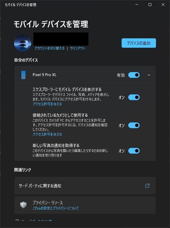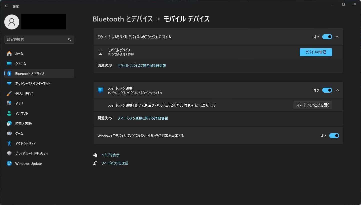 - Windowsの「設定」> 「Bluetooth とデバイス」 > 「モバイル デバイス」で端末の連携を確認(Windows 10では設定ホーム画面に直接表示)