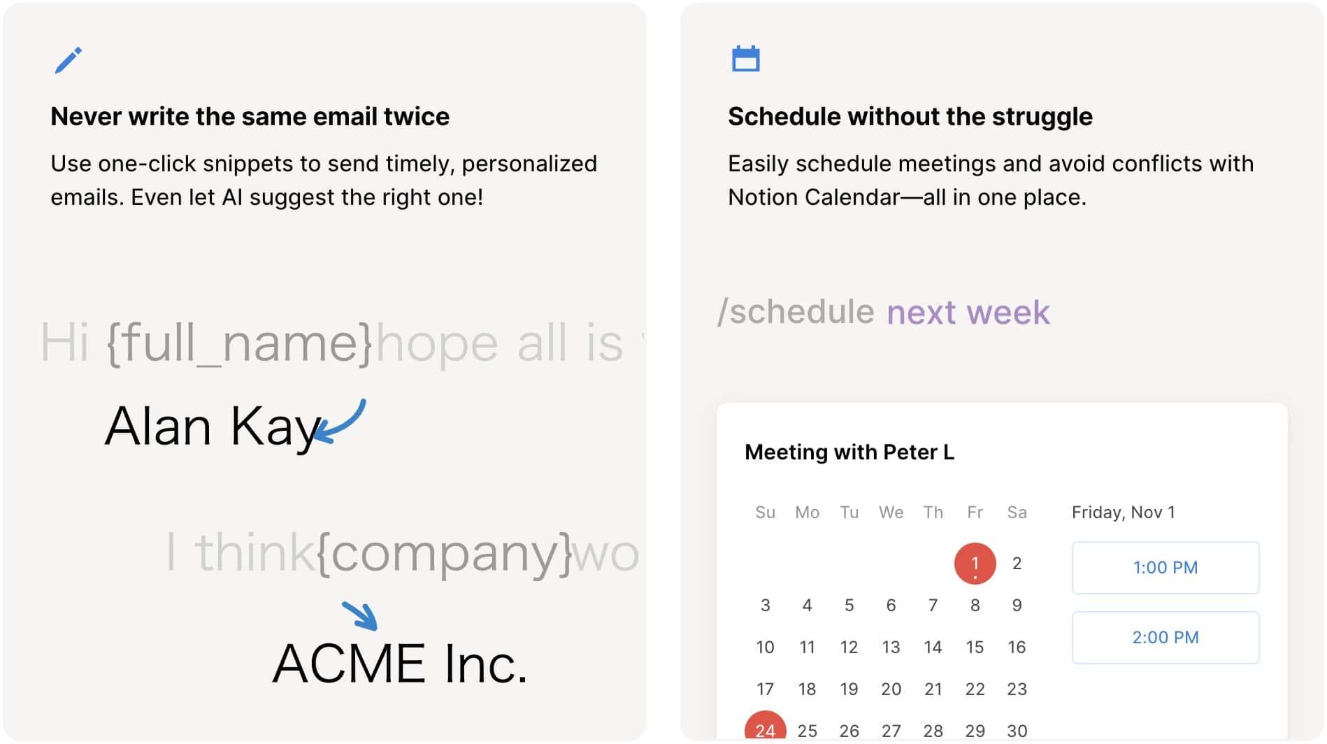 また、Notion Calendarとの統合も便利な機能だ。ユーザーは、自分のカレンダーと空き時間に直接リンクするスケジュール ボタンをメールに追加できるようになると言う。