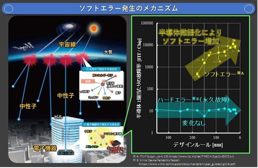 半導体ソフトエラーとは、宇宙線や放射性物質から放出される中性子が半導体素子に衝突して一時的な誤動作を引き起こす現象である。