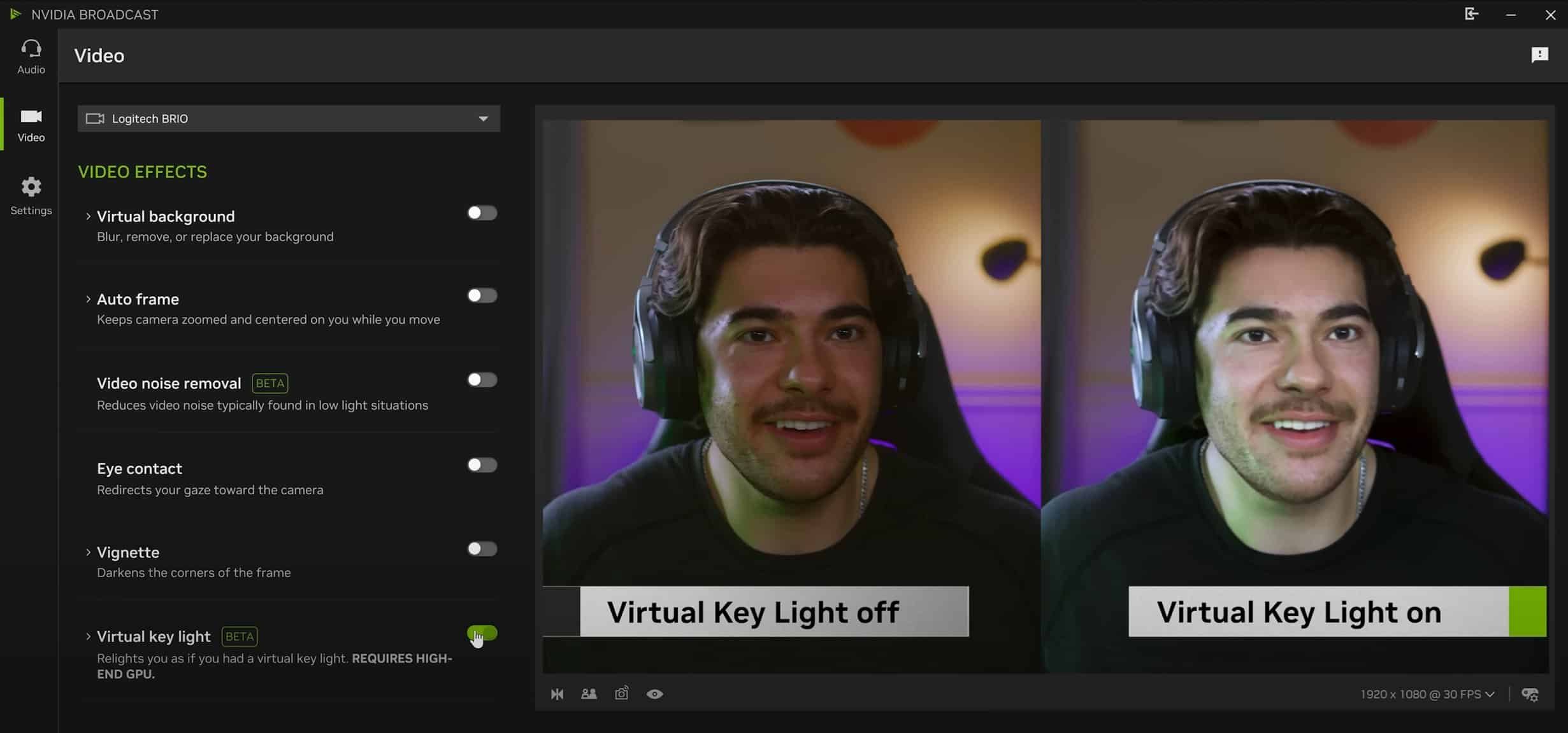 もう一つの目玉機能である「Virtual Key Light」は、中々自宅では導入が難しいスタジオ照明の効果をシミュレートする物だ。従来、プロフェッショナルな映像制作には、キーライト(主光源)をはじめとする複数の照明機材が不可欠とされてきた。この機能は、カメラからの入力映像をリアルタイムで解析し、物理的な照明機材がなくても、あたかもスタジオで適切な照明が当てられているかのような効果を実現する。これにより、在宅での配信やリモートワーク時のビデオ会議においても、プロフェッショナルな映像表現が可能となる。