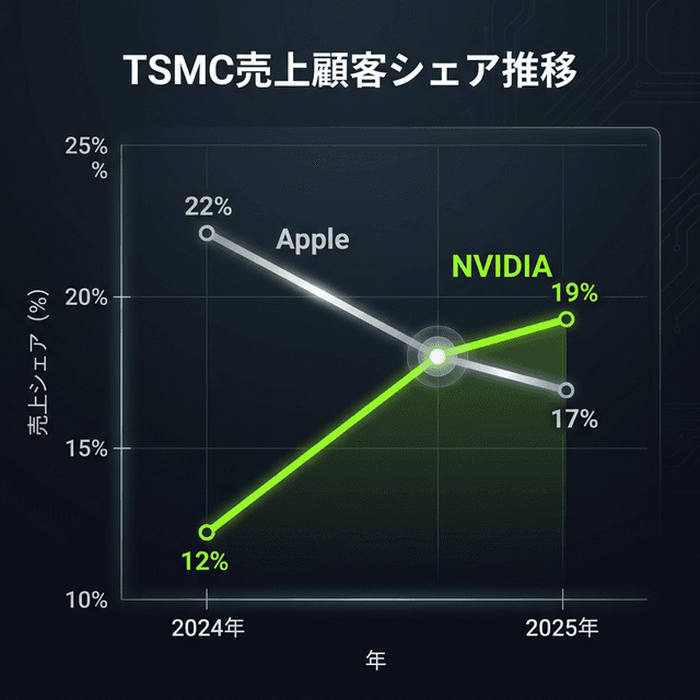 しかし、2025年の決算報告はこの長年の強固な序列を完全に覆した。NVIDIAがTSMCにもたらした収益は、前年の3,522億7,000万新台湾ドルから7,269億新台湾ドル(約232〜234億米ドル)へと驚異的な飛躍を遂げたのだ。これはTSMCの総収益の19%に相当する巨大な規模である。対するAppleの寄与額は6,451億新台湾ドル(総収益の17%)にとどまり、絶対額としては前年比3.33%の微増であったものの、相対的なファウンドリ全体に対するシェアでは2024年の22%から大きく後退する結果となった。