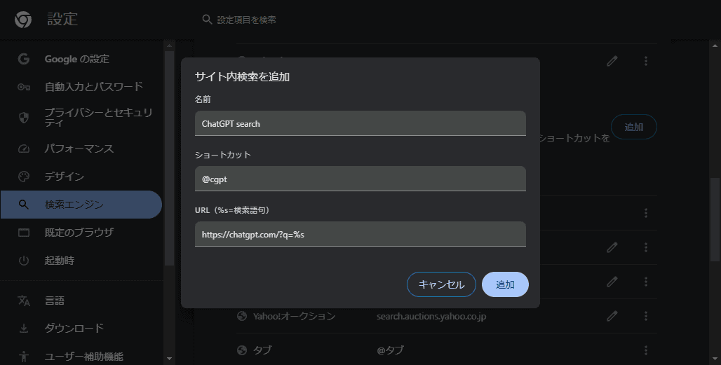重要な点として、この拡張機能を使用せずともChatGPT Searchを利用する方法が存在する。以下の手順でChromeに新しい検索エンジンを手動で追加することが可能である: