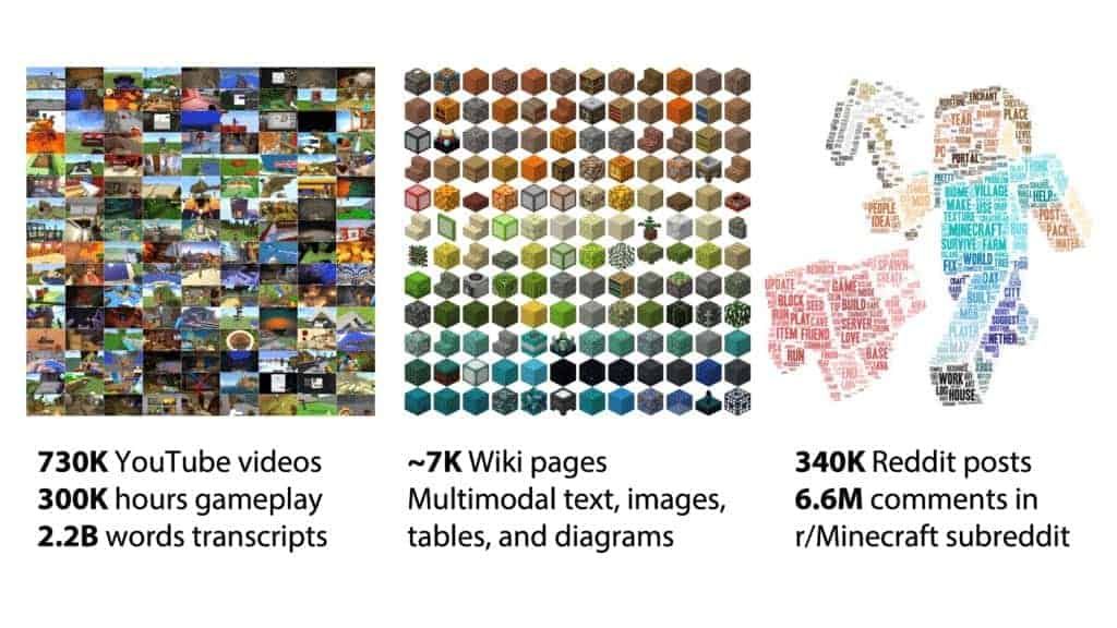 MineDojoフレームワークにMinecraftをプレイさせるために研究者らは、73万本のMinecraft YouTubeビデオ(22億語以上が書き起こされた)、Minecraft wikiからかき集めた7000のWebページ、Minecraftゲームプレイに関する34万のReddit投稿と660万のRedditコメントなど、膨大なデータを与え、トレーニングを実施した。