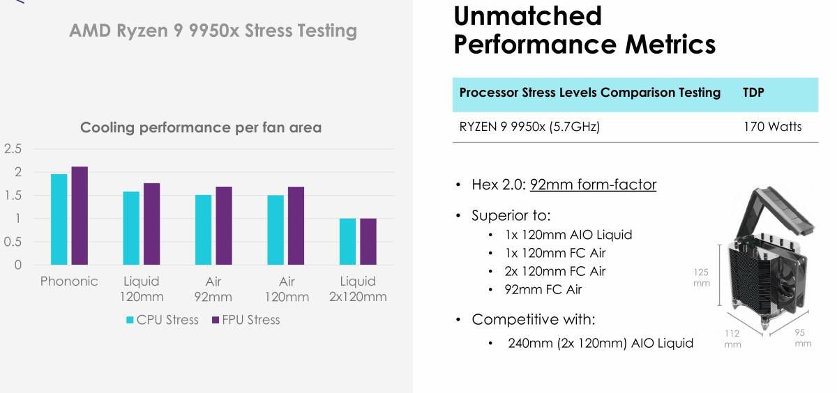 Hex 2.0の性能は、従来の240mm全水冷システムと競合するレベルにあるという。具体的には、AMDのRyzen 9 9950Xを使用したストレステストで、液冷システムや空冷システムを上回る冷却性能を示したとPhononicは主張している。