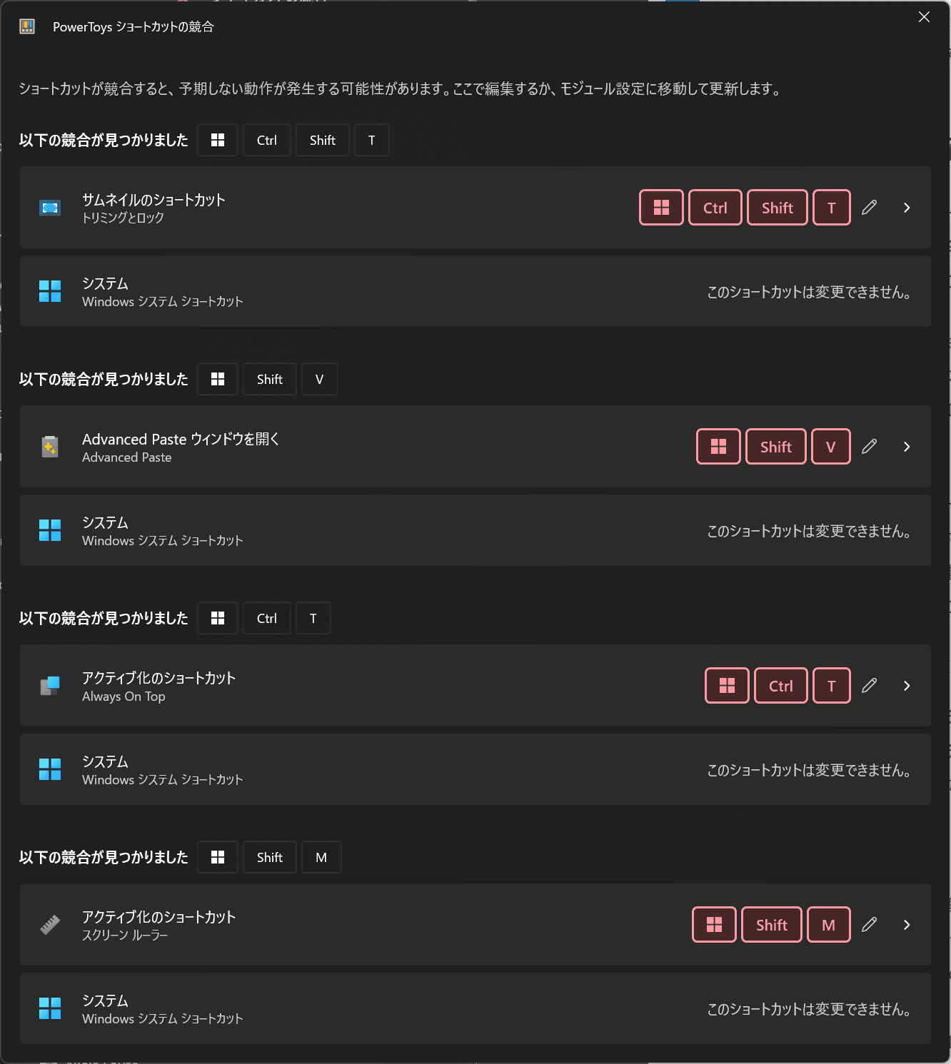 - 視覚的な警告: PowerToysの設定画面を開くと、他のモジュールやWindowsシステムのショートカットと競合しているものが、一目でわかるように赤色でハイライトされる。